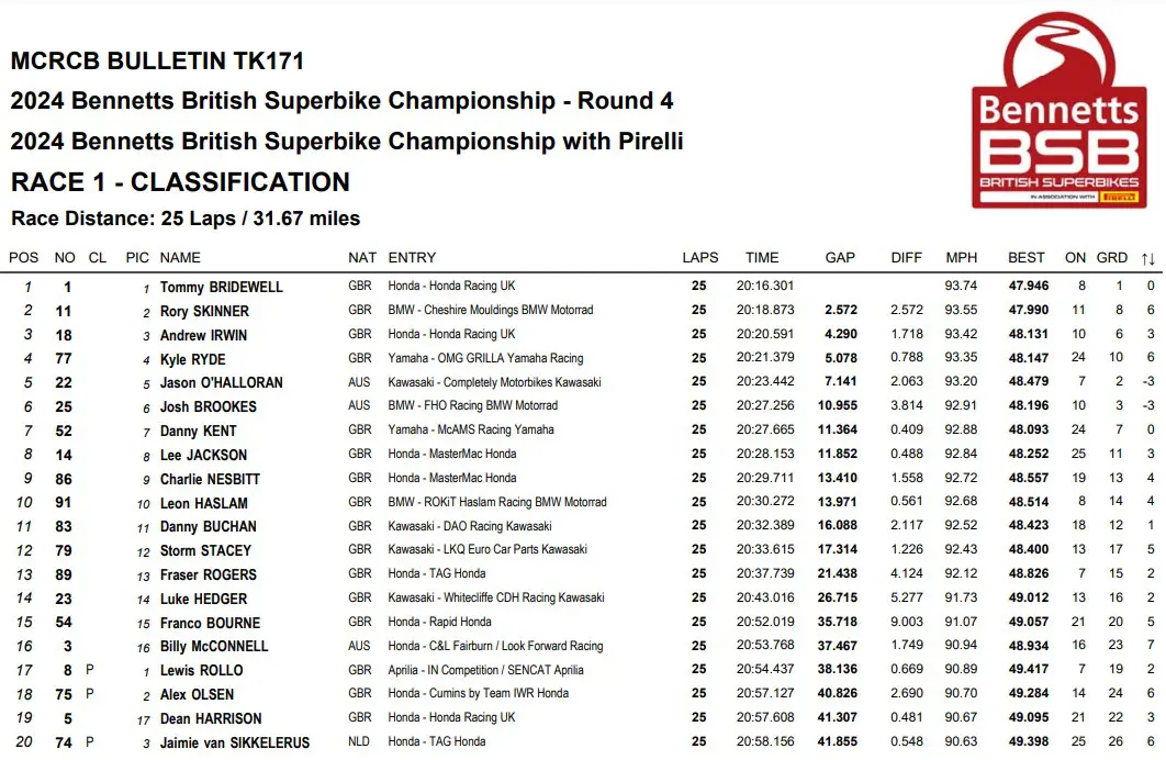 この件についての解明を待っている間、実際には、トップ5が十分に手の届くところにあるように見えたにもかかわらず、非常に重いゼロが残っており、これはブライドウェルとダニー・ケントの-4(ジョシュ・ブルックスに次ぐ7位)の接近に有利である。 カイル・ライドは-8で少し遅れています(ジェイソン・オハペロランの前の4位)。 こうした中、地元のアイドルであるロリー・スキナー(チェシャー・モールディングスTAS BMWで2位)はホームコースでその定評あるライディングスキルを発揮し、逆転でMoto2世界選手権での2年間の経験から復帰して以来初の表彰台を獲得した。 明日は残りの 2 レースで同じことを繰り返します。 多くの期待される主人公にとっては償いの機会。 レオン・ハスラム(不可解にも10位)から、ピーター・ヒックマン(FHO BMWの技術的問題によりリタイア)を経て、クリスチャン・イドンとライアン・ヴィッカーズ(表彰台を追いかける途中に接触によりクラッシュ)まで。