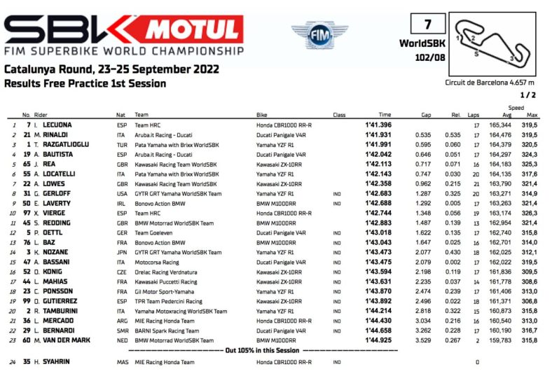 Honda nam de teugels van de sessie met de voormalige MotoGP-rijder in handen door een halve seconde sneller te rijden dan alle anderen. Het is oké dat de CBR-RR hier sterk rijdt (zie Bautista’s derde plaats vorig jaar), maar de marge is te groot om niet te vermoeden dat Lecuona de SCQ-band heeft gebruikt, dat is de kwalificatie, die Pirelli hier heeft vergezeld met een even superzachte voorkant. Michel Rinaldi liep daarentegen heel sterk met meer consistentie en slaagde erin zijn boxgenoot Alvaro Bautista achter zich te laten. De Spanjaard hier is altijd erg sterk geweest, sinds GP-tijden, dus hij is de logische favoriet van deze ronde, als alles volgens plan verloopt. Regen zou het onbekende kunnen zijn: de voorspellingen zijn slecht en deze FP1 was mogelijk de enige droge sessie. We zullen wel zien.