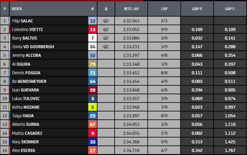Première séance qui voit également en action le vice-champion Moto2 Ai Ogura, mais aussi Celestino Vietti, encore convalescent de sa blessure au bassin et clairement en difficulté. Ou peut être pas? Le fait est que le pilote Fantic parvient à s’assurer une place dans le top 4, accédant ainsi à la séance suivante. Avec lui, Filip Salac et le duo Fieten Olie Racing GP réussissent, complétant la « zone Q2 » du classement.