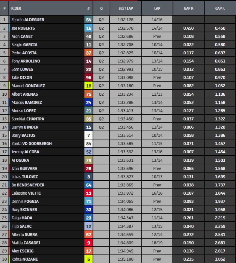 Il y a un coureur en particulier à surveiller, celui qui a fait bonne impression au sommet jusqu’à présent. Fermin Aldeguer ne lâche rien, au contraire il continue sur son rythme et réécrit une fois de plus le record absolu de Moto2, personne ne peut lui ravir la pole position en Australie. Première ligne 100% espagnole avec Aron Canet et le deuxième pilote Speed Up, Alonso Lopez, tandis que Pedro Acosta n’est “que” 5ème sur la grille. Mais on peut parier là-dessus, prêt pour une autre course en grand protagoniste… Tony Arbolino termine 8ème, Celestino Vietti prend finalement la 13ème place sur la grille.