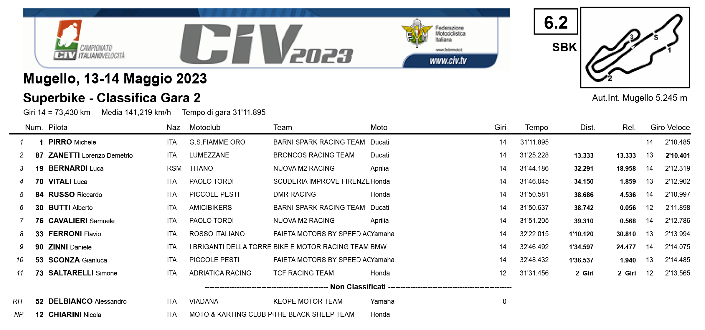 Premier podium au CIV Superbike pour Luca Bernardi sur l’Aprilia Nuova M2 qui dépasse Luca Vitali avec une crise de pneu dans le dernier tour. Vitali, sur Honda Improve, avait fait une excellente course, toujours proche du podium, mais dans les phases finales, son pneu arrière a chuté drastiquement. Hormis le dépassement final de Bernardi sur Vitali, la course n’a pas donné d’émotions avec Pirro qui s’est immédiatement envolé avec la Ducati Barni et a ensuite réussi à prendre l’avantage sur Lorenzo Zanetti.