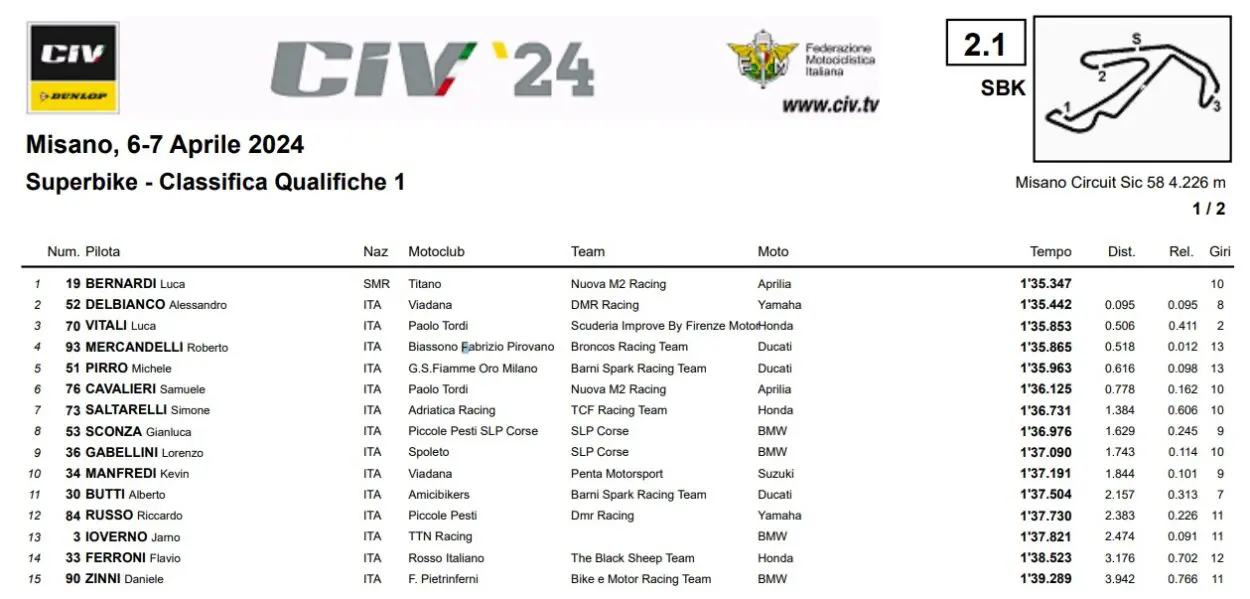 QUALIFICATIONS MISANO CIV SUPERBIKE 2024 1 – RÉSULTATS: