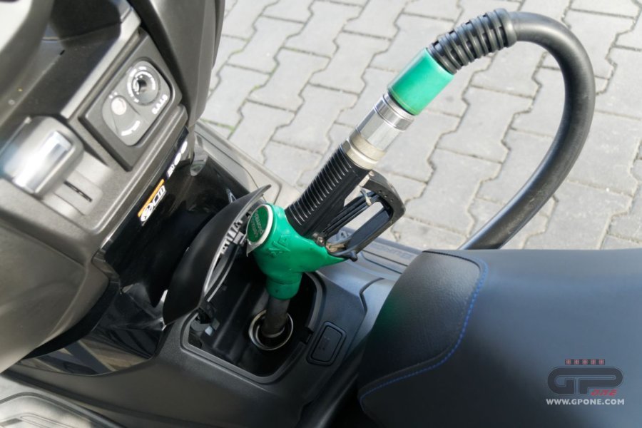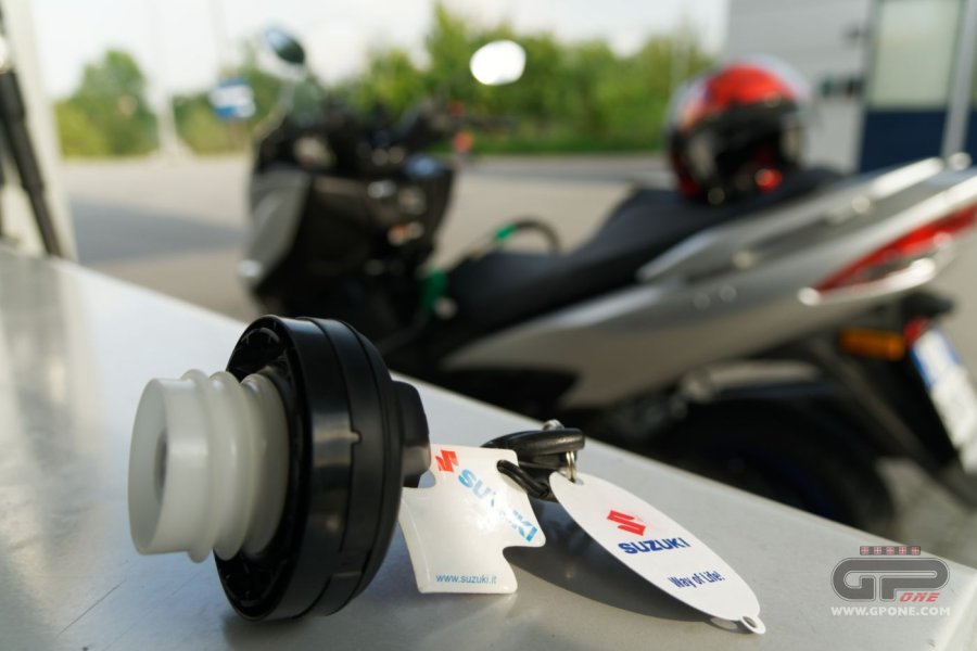 Heureusement pour nous le Burgman 400 offre des données sur la consommation moyenne et instantanée, un détail qui nous a permis de collecter des informations plus rapidement et plus complètement, puis d’effectuer les vérifications nécessaires de manière empirique. En fait, nous avons trouvé la pompe à essence et la calculatrice en main en moyenne environ 4% de différence entre les valeurs indiqué sur l’instrumentation (plus optimiste) et les données effectivement détectées. La technique est la même, aussi simple qu’efficace. Vous faites le plein, réinitialisez le compteur kilométrique partiel et au prochain plein vous calculez la valeur moyenne de la consommation, en divisant les kilomètres par les litres d’essence.
