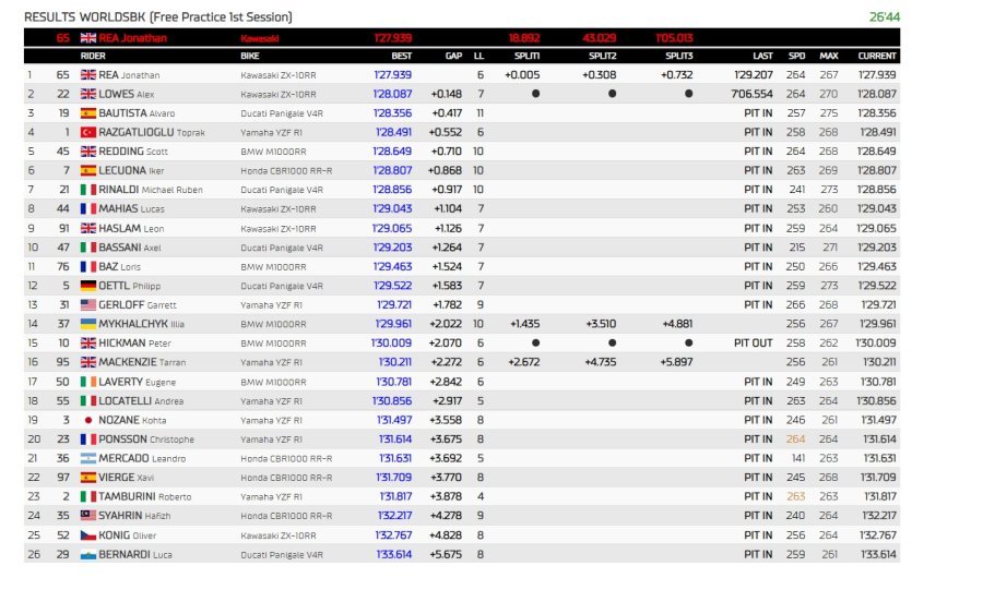 11:12 도닝턴은 일종의 자격이 되어가고 있으며, 빨간 헬멧이 몰려들기 시작합니다! 한편 Rea가 나오는 동안 Toprak은 1’27″805로 첫 번째 기록을 세웠습니다. Rea는 134,000분의 2로 두 번째입니다. Hickman은 13번째로 Gerloff와 Locatelli입니다. Bautista는 대신 5번째입니다.