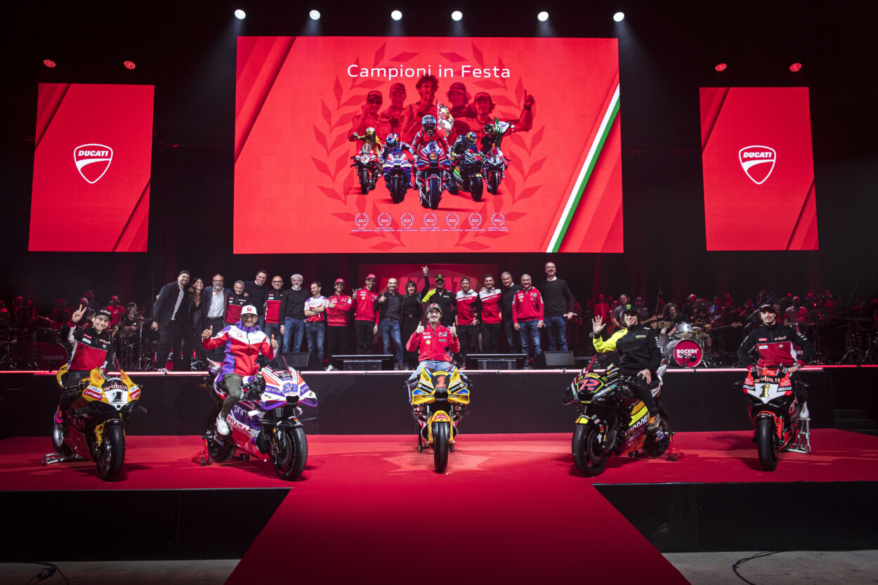L’Unipol Arena et les rues autour de la célèbre installation polyvalente de Bologne ont été littéralement colorées de rouge pour accueillir les fans et les grands protagonistes de la soirée : les Champions Ducati. Les trois Champions du Monde 2023 sont montés sur scène, Francesco Bagnaia (Champion du Monde MotoGP avec la Desmosedici GP du Team Ducati Lenovo), Alvaro Bautista (Champion du Monde WorldSBK avec la Panigale V4 R du Team Aruba.it Racing – Ducati) et Nicolò. Bulega (Champion du Monde WorldSSP avec la Panigale V2 du Team Aruba.it Racing WSSP). Avec eux se trouvaient également les deux pilotes Ducati sur le podium du classement mondial MotoGP, Jorge Martin (Pramac Racing Team) et Marco Bezzecchi (VR46 Racing Team). Deux pilotes qui ont suivi une formation exceptionnelle, capable de transmettre la supériorité des pilotes et motos Ducati dans les principales compétitions mondiales de deux roues.
