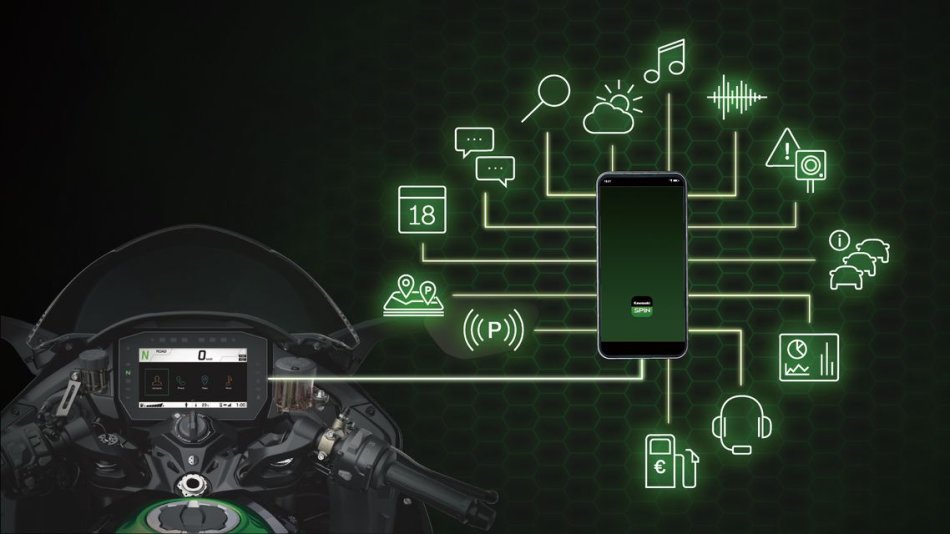 Côté « environnement du pilote », Kawasaki n’a certes pas épargné la dépense en proposant une large dalle TFT couleur de 6,5 pouces capable de transmettre une multitude d’informations sur l’état de la moto. Pour 2022, Ninja H2 SX SE sera livré avec Kawasaki SPIN En standard, c’est-à-dire un système d’infodivertissement “écran dans l’écran”, SPIN permet au pilote de se connecter à son smartphone et d’accéder à environ 20 applications sur le panneau TFT qui couvrent des informations sur : la navigation, la météo, la musique, les journaux de contacts et bien plus encore comme , par exemple, des fonctionnalités sur la communication entre le pilote et le passager.