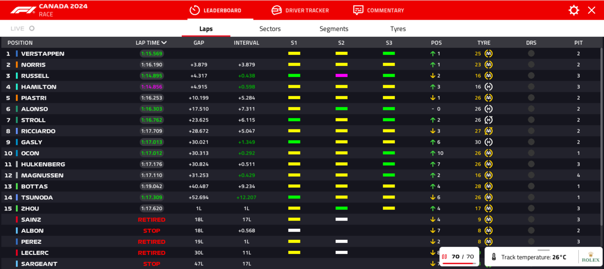 Hamilton når sedan pallkanten, efter att ha återhämtat sig från sjunde startplatsen. Femte plats för den andra McLaren, Oscar Piastri, som dukade under i slutet av den sjufaldige Formel 1-världsmästaren Fernando Alonsos Aston Martin var sjätte före sin lagkamrat Lance Stroll. Åttonde plats var Daniel Ricciardo med Racing Bulls, före de två alperna. Pierre Gasly kommer före Esteban Ocon, en ständigt ökande tillväxt för det franska huset.