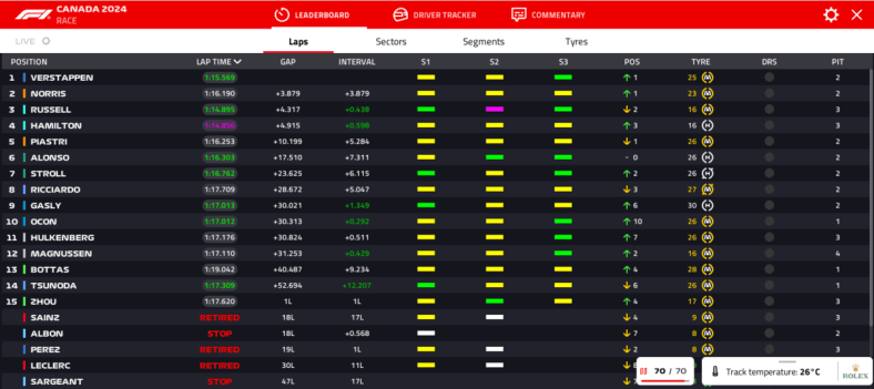 Hamilton accède alors au bord du podium, après avoir remonté la septième place de départ. Cinquième place pour l’autre McLaren, celle d’Oscar Piastri, qui a finalement succombé face à l’Aston Martin du septuple champion du monde de Formule 1 Fernando Alonso, sixième devant son équipier Lance Stroll. La huitième place revient à Daniel Ricciardo avec Racing Bulls, devant les deux Alpine. Pierre Gasly arrive devant Esteban Ocon, une croissance toujours croissante pour la maison française.