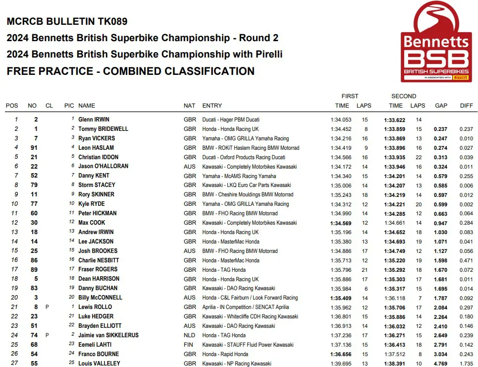 BRITISH SUPERBIKE 2024 OULTON PARK – CLASSEMENT COMBINÉ D’ESSAI GRATUIT: