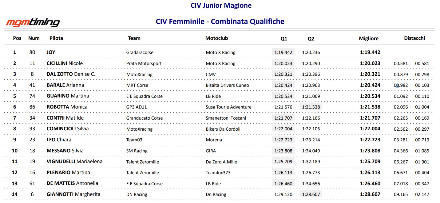 CIV FÉMININ 2024 MAGIONE – CLASSEMENT COMBINÉ Q1+Q2: