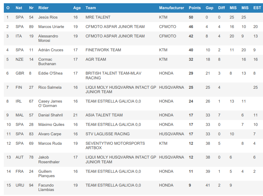 Déplacement réduit aux 2/3 de la distance initiale. Nous partons également sur une piste mouillée dans la classe Moto3 du Mondialino, mais certaines sections commencent à sécher… Ainsi commence la course unique à Estoril : le poleman Buchanan démarre bien, suivi d’Uriarte, O’Gorman et Morosi, qui a pris un excellent départ. de la huitième place au grill. Malheureusement, il va bientôt perdre le contact… Quatre d’entre eux s’enfuient devant : Salmela rattrape également son retard, bien décidée à rattraper le malheureux double zéro de Misano. Quel dommage cependant pour O’Gorman, qui a subi un violent highside dans l’avant-dernier tour qui l’a mis hors course. C’est alors que le petit groupe initial se disloque : Rico Salmela s’envole, la première victoire en JuniorGP arrive pour le Finlandais ! Mais derrière, Marcos Uriarte et Cormac Buchanan se sont battus jusqu’au bout pour la deuxième place, atteignant la ligne d’arrivée dans cet ordre. Plus loin, Alessandro Morosi parvient à récupérer quelques positions et prend ainsi la 4ème place, meilleur italien et, comme mentionné, le seul dans les points.