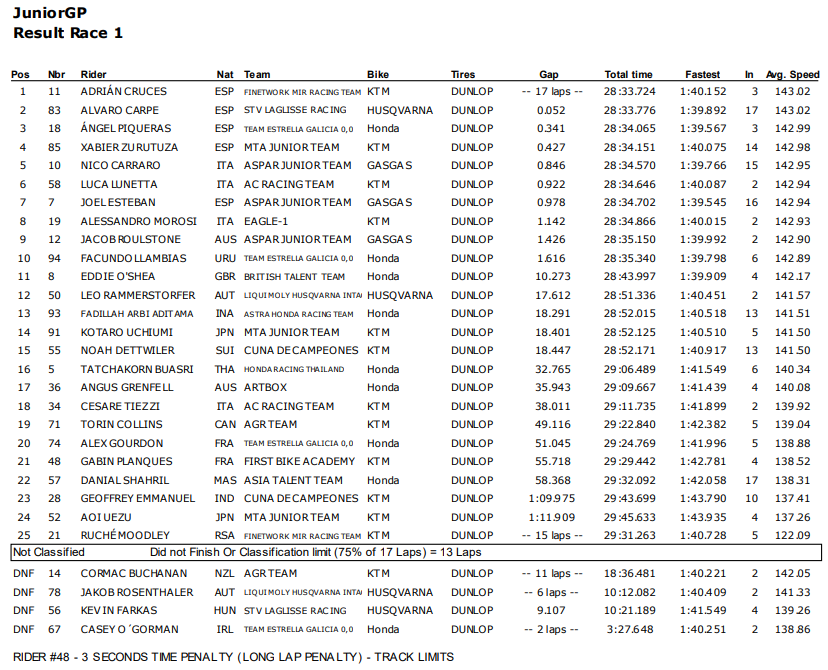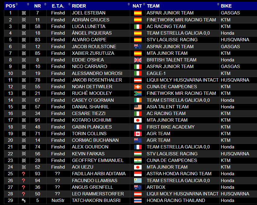 Jusqu’à ce que le groupe se sépare : à 10 tours de l’arrivée, il en reste huit, dont les agressifs Lunetta, Carraro et Morosi, pour une bataille qui se poursuit jusqu’au drapeau à damier. Une finale qui ne récompense malheureusement pas notre équipe, Lunetta notamment commet une erreur qui lui coûte le podium. Feu vert pour un top 4 100% ibérique avec Adrian Cruces triomphant d’Alvaro Carpe et Angel Piqueras, avec le poleman Zurutuza au pied du podium. Sur la feuille de match les chutes d’O’Gorman, Farkas, Rosenthaler et Moodley (redémarré), KO technique plutôt pour Buchanan.