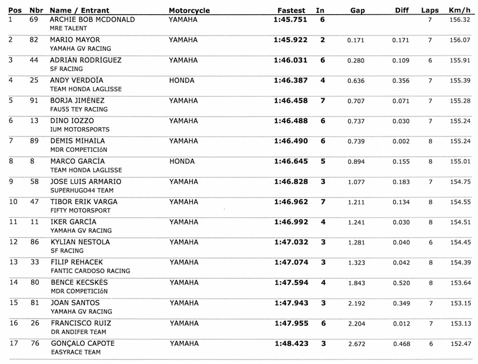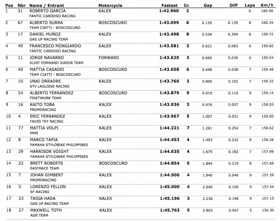 Der er en antydning af italienskhed på pole, men vi taler kun om den ‘fantiske side’ af holdet. Poleman er Roberto Garcia, som får sit gennembrud i Portimao, men ved siden af ham vil være Alberto Surra, fast besluttet på at gøre meget mere end de to foregående runder. Anden række for Francesco Mongiardo, sjetteplads ved starten for kategorileder Mattia Casadei.