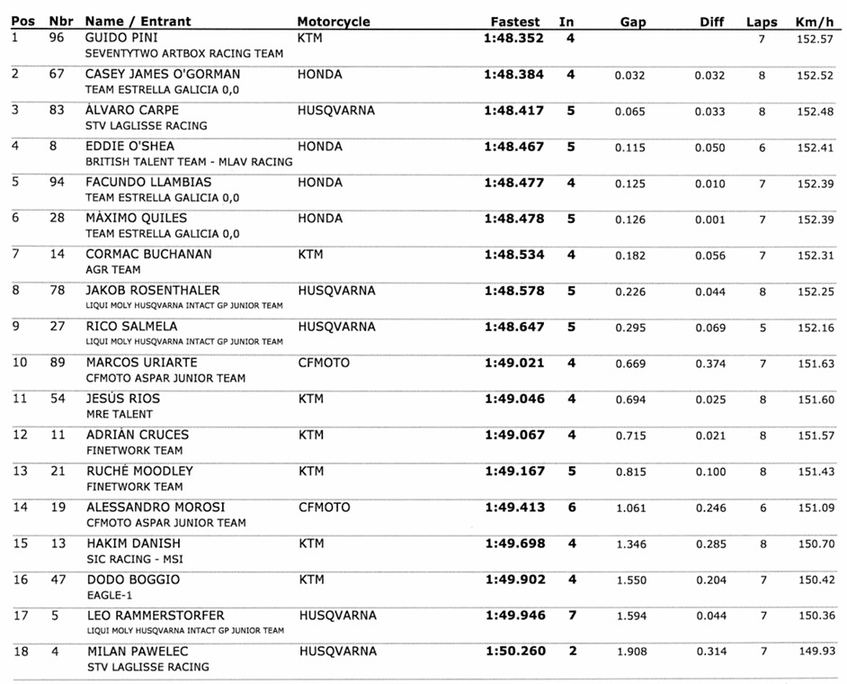 Her er Guido Pini! Som nævnt er han dagens konge, der slår Casey O’Gorman og Alvaro Carpe. Et hul på et par hundrededele, men nok til at sikre ham pole i første runde i JuniorGP. Det påvirker ikke den generelle klassementsleder Marcos Uriarte, som starter fra 10. pladsen på banen i morgen, med de andre italienske fyre også bagefter.