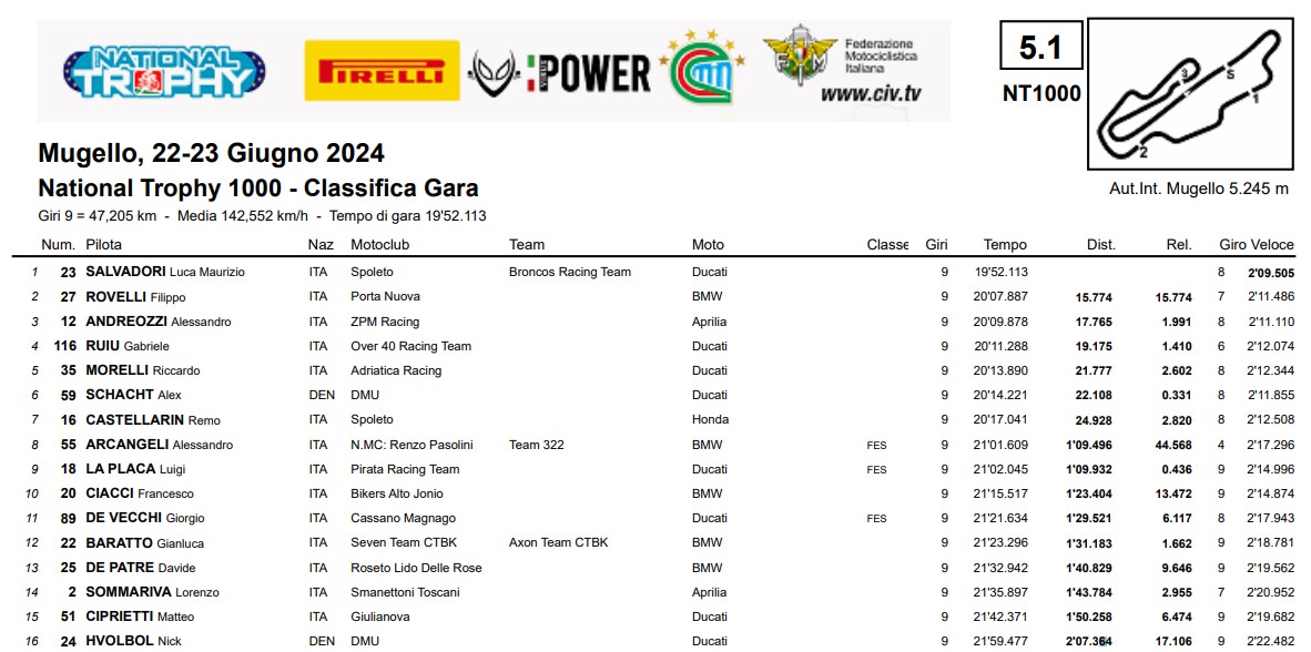 Een integraal onderdeel van het peloton achter Salvadori was ook een verrassende Riccardo Morelli op Ducati, vijfde voor zijn merkgenoot Alex Schacht en een altijd strijdlustige Remo Castellarin (soms in de podiumzone) met de enige Honda op de grid. Met Alessandro Arcangeli als achtste in de comeback zakte een onherkenbare Matteo Ciprietti naar de vijftiende positie. De terugkeer van Flavio Ferroni (REVO Aprilia) eindigt met een crash in de eerste ronde bij Casanova-Savelli, wachtend op het vinden van zijn Blacksheep Honda voor de Race avond van Misano (3-4 augustus) van de CIV Superbike. Voor het National Trophy 1000-circus is de afspraak op 7-8 september op het Cremona Circuit.
