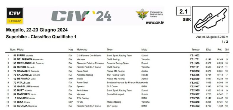 CIRCUIT MUGELLO CIV SUPERBIKE 2024 – RÉSULTATS QUALIFICATIONS 1: