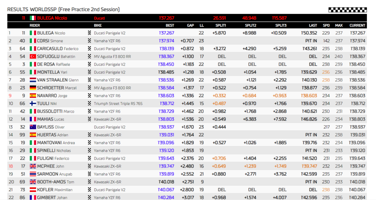 Nicolò Bulega, op Ducati Aruba, wandelt in de tweede vrije training van de Supersport op Misano. De rijder van de dag is echter Simone Corsi op Yamaha AltoGo. Na de vierde tijd in de ochtend staat hij tweede in de middag voor Federico Caricasulo op Ducati en Bahattin Sofouglu op MV Agusta. Raffaele De Rosa en Yari Montella worden respectievelijk vijfde en zesde. Dicht bij de top 10 Marco Bussolotti, wildcard.