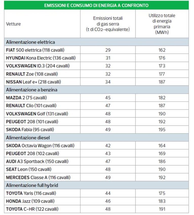 Kategori mobil di pasar Eropa ditunjukkan dengan huruf abjad: model yang diperiksa masuk ke segmen B dan C, yaitu mobil kecil dan mobil menengah. Mobil kecil hampir selalu lebih baik daripada mobil besar karena lebih ringan, mengkonsumsi lebih sedikit dan membutuhkan baterai yang lebih kecil. Jika Anda tidak memiliki kebutuhan khusus, membeli mobil sedang atau kecil sudah menjadi kriteria yang baik untuk pilihan lingkungan. Dalam pengujian, mobil listrik berdampak jauh lebih sedikit pada emisi gas rumah kaca selama seluruh siklus hidup: sekitar 30% lebih sedikit daripada kendaraan lain. Dibandingkan dengan total penggunaan energi, bagaimanapun, ini tidak begitu kompetitif, bahkan jika itu tetap menjadi jenis kendaraan terbaik; kekuatan mobil listrik dibandingkan dengan mobil tradisional sebenarnya adalah pasokan listrik dengan energi dari sumber terbarukan. Sekalipun konsumsi energi total selama masa pakai kendaraan kurang lebih sama, ada keuntungan besar bahwa sebagian besar tidak berasal dari sumber fosil, seperti halnya dengan mobil berbahan bakar bensin atau diesel. Peningkatan penggunaan energi bersih mengurangi emisi karbon dioksida dan gas rumah kaca lainnya.