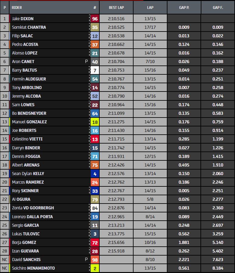 再びアルゼンチンからスタートし、南米で勝利を収めた新しい Moto2 世界のリーダー、アルボリーノに注目が集まっています。 昨年はオースティンで優勝しましたが、アンコールしてもらえますか? これは、ロンバードのドライバーがラウンドの主役の中ですぐに見られる瞬間に見られます。驚くべきことに、バルタスが長い間トップにいます。 アコスタが期待を下回る GP の後にどのように振る舞うか、これまでのところテキサスで大きな結果が得られていないことを確認します。 一方、セルジオ ガルシアは、この GP での最初の Moto2 クラッシュであり、ターン 12 でのクラッシュで、影響はありませんでした。 また、オースティンでの最初のセッションでダウンしたのは彼だけであり、ジェイク ディクソンが首位でフィニッシュしました。