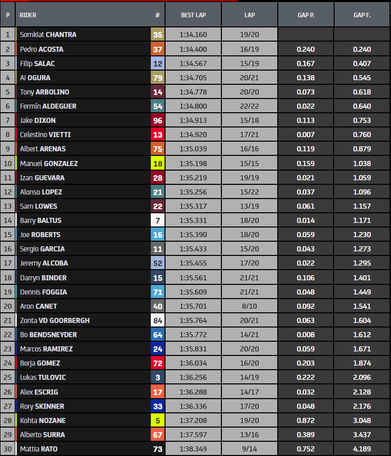 Τα δύο παιδιά της Honda Team Asia σημείωσαν ένα-δύο πέρυσι σε αυτή την πίστα. Είναι σίγουρα μια επιπλέον ώθηση σε μια σεζόν Moto2 που δεν ξεκίνησε όπως είχε προγραμματιστεί. Στην πραγματικότητα, τόσο ο Chantra όσο και ο Ogura εμφανίστηκαν αμέσως πολύ ψηλά στη βαθμολογία, όπως και οι παγκόσμιοι μονομαχιστές Acosta, ηγέτης του Moto2 ξανά στο Silverstone και ο Arbolino. Αργότερα, όμως, μπαίνουν και οι δύο οδηγοί Speed ​​​​Up και Vietti, για να συνθέσουν ένα ποικίλο top 7, αλλά η σοβαρότητα ξεκινά μόνο στα τελευταία λεπτά αυτής της πρώτης συνεδρίας του αυστριακού Σαββατοκύριακου. Ο Pedro Acosta προσπαθεί, θέλει τον καλύτερο χρόνο της συνεδρίας, αλλά ο Somkiat Chantra δεν συμφωνεί: στην πραγματικότητα, είναι ο Ταϊλανδός αναβάτης που κλείνει στην κορυφή, ακολουθούμενος από τον ηγέτη του Moto2 και από τον Filip Salac, ο οποίος ανέβηκε ξανά στο 3 πρώτοι στα τελευταία λεπτά.
