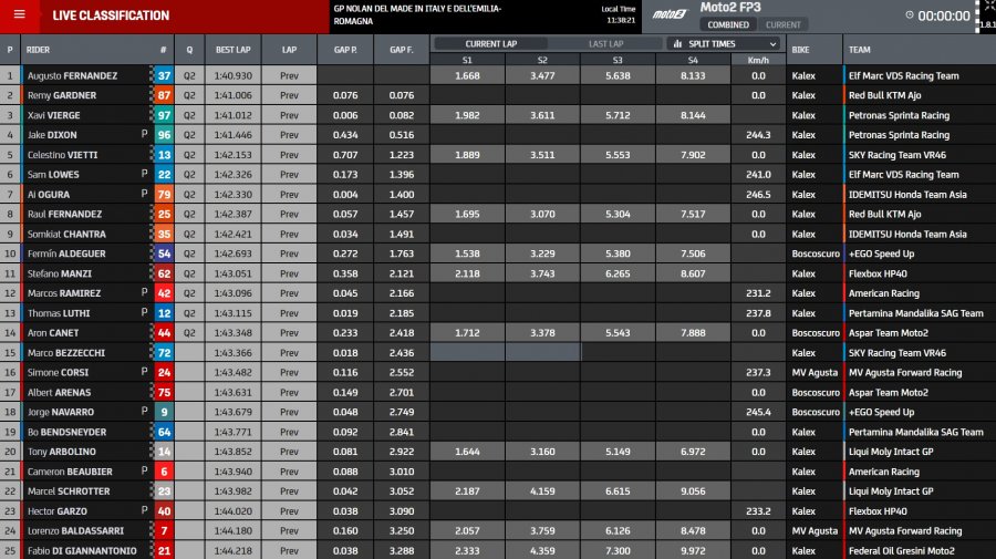 Cinquième Raul Fernandez (21 ans aujourd’hui), en pleine bataille avec son coéquipier Rémy Gardner (seulement 13e) à la clé du championnat, mais tous deux directement en Q2. De retour au classement, Aron Canet (7e), Somkiat Chantra (8e), Hector Garzo (9e) et Celestino Vietti (10e) sont également entrés dans le top 10. A signaler les accidents sans gravité de Mattia Casadei et Tommaso Marcon, appelés par Italtrans Racing Team et NTS RW Racing Team comme remplaçants. Au lieu, Joe Roberts ne participera pas au reste du week-end, déclaré inapte en raison d’une fracture de la clavicule gauche suite à l’accident d’hier.