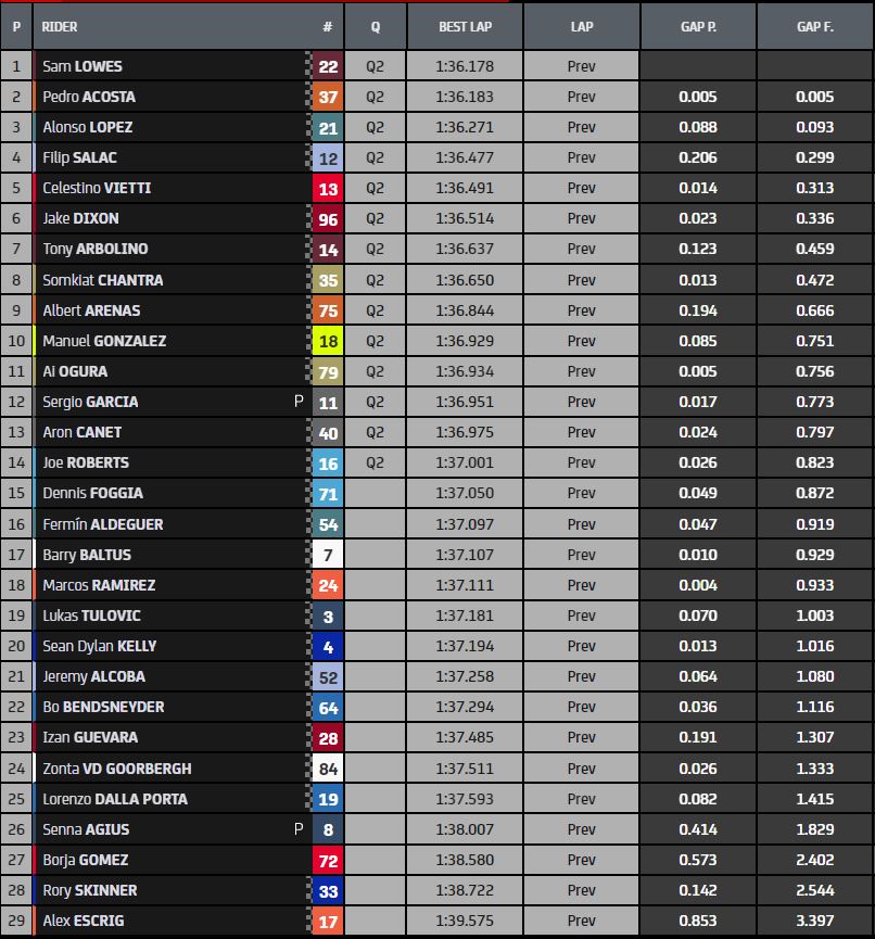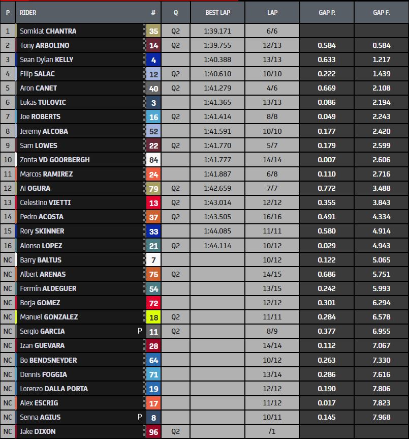 Classement inchangé par rapport à vendredi au Mans. Les leaders Moto2 Pedro Acosta et Tony Arbolino entrent en Q2 sans problème, tout comme Celestino Vietti malgré la chute de cette dernière séance. La dernière séance d’essais se clôt avec Somkiat Chantra en tête, les temps et classements sont définis ci-dessous.