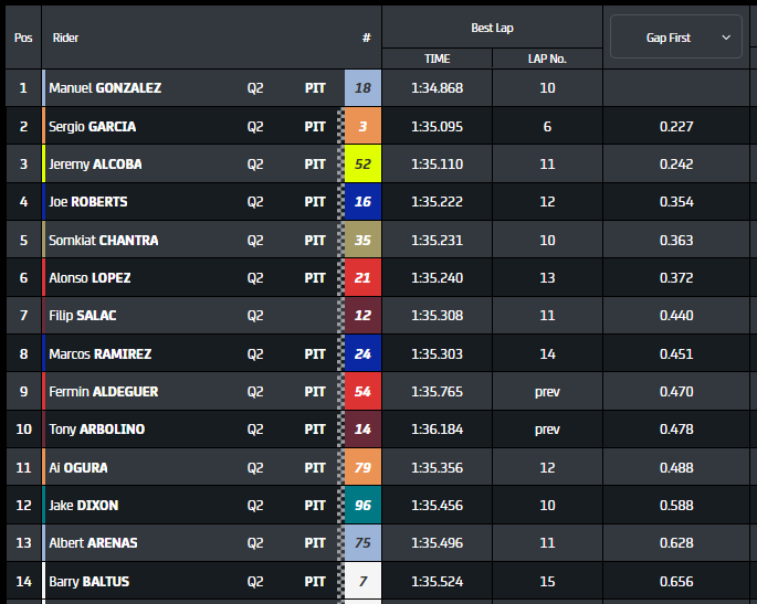 Ce n’est qu’un début : Garcia arrive à plein régime et reprend la tête, mais ce ne sera pas la dernière. Gonzalez y a également contribué en se hissant au sommet dans les dernières minutes, mais pour lui on a également enregistré une chute sans conséquences, peu après celle du débutant Dani Munoz. Le classement ne changera pas, le porte-drapeau Gresini termine aux commandes devant Sergio Garcia et Jeremy Alcoba, Tony Arbolino 10ème est le seul Italien qui accède directement à la deuxième séance de qualification.
