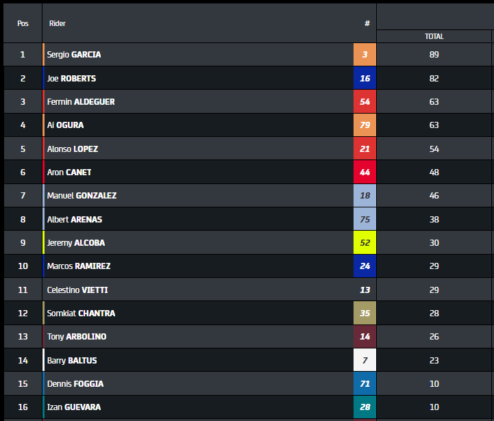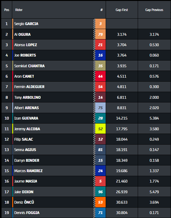 Sergio Garcia et Ai Ogura ont offert le premier doublé Moto2 au débutant MT Helmets-MSi, mais avec Alonso Lopez 3ème est venu le premier podium de catégorie complètement monopolisé par Boscoscuro. KALEX qui ne figure pas dans le top 3 pour la première fois depuis le GP de Valence 2012 (podium avec trois Suter) ! Une journée mémorable pour la marque vénitienne, signe supplémentaire d’un début de saison vraiment incroyable. Applaudissements cependant pour Aron Canet, auteur d’une course de premier plan malgré ses conditions physiques loin d’être parfaites, Tony Arbolino termine 8ème. Voici comment cela s’est passé sur le circuit Bugatti.