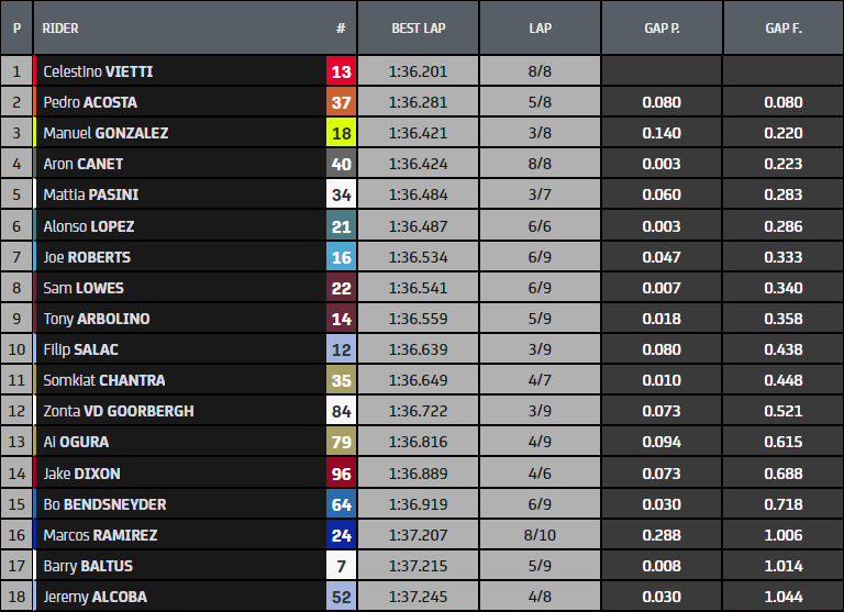 Semuanya sudah siap untuk memperebutkan pole, kami memiliki daftar 18 pembalap yang siap diperebutkan. Dan di antara ketiga pembalap Italia ini yang langsung tampil menonjol: Vietti, yang langsung berambisi untuk meraih pole position, namun juga Pasini dan Arbolino yang segera meraih posisi lebih tinggi. Saat itulah tiba