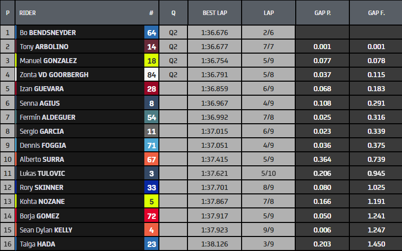 Seperti yang terlihat di kesempatan lain, Fabio Quartararo berada di garasi Marc VDS bersama temannya Tony Arbolino. Pembalap Lombard itu belum terlalu bersinar sejauh ini di Misano, tapi dia memulai sesi ini dengan baik, segera menetapkan waktu sementara terbaik di akhir pekan. Bo Bendsneyder lebih baik darinya, meski hanya seperseribu! Setelah beberapa pergolakan, Manuel Gonzalez dan Zonta van den Goorbergh juga mendarat di Q2, kuartet yang terpaut 115 perseribu. Guevara dan pemain pengganti Agius adalah yang pertama dikecualikan, Aldeguer tidak dapat muncul, karena masalah dengan lengannya (mungkin karena pakaian ketat) dan mesin Boscoscuro-nya.