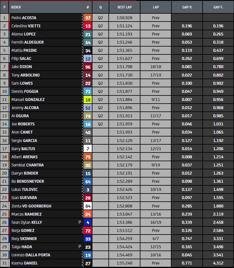 La plupart des temps combinés se réfèrent à la session du matin au Mugello. Cependant, le fait que Pedro Acosta soit toujours devant ne change rien, même dans une séance plus lente interrompue par un drapeau rouge momentané dû à un accident. Dans le top 14, donc en Q2 provisoire, on retrouve cependant toujours quatre Italiens : un bon départ pour Celestino Vietti, Tony Arbolino, le wild card Mattia Pasini et le rookie Dennis Foggia ! C’est ainsi que s’est terminé vendredi sur le circuit toscan.