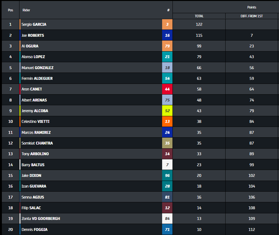 Bardzo zacięta i zdecydowana walka dopiero na mecie. Joe Roberts ma przewagę, wyprzedził Manuela Gonzaleza zaledwie o 67 tysięcznych i tym samym odniósł swoje drugie zwycięstwo w Moto2, a także drugi sukces w sezonie 2024 poza Boscoscuro. Hiszpan z Gresini Racing musi zadowolić się drugim miejscem miejsce, trzeci stopień podium w końcu dla Alonso Lopeza, który jedyną satysfakcję dnia dał Boscoscuro. Celestino Vietti na mecie jest 7., wielka szkoda dla Mattii Pasiniego, który rozbił się na ostatnim okrążeniu… Oto jak przebiegł wyścig z dystansu skróconego po wcześniejszej czerwonej fladze w Moto3.