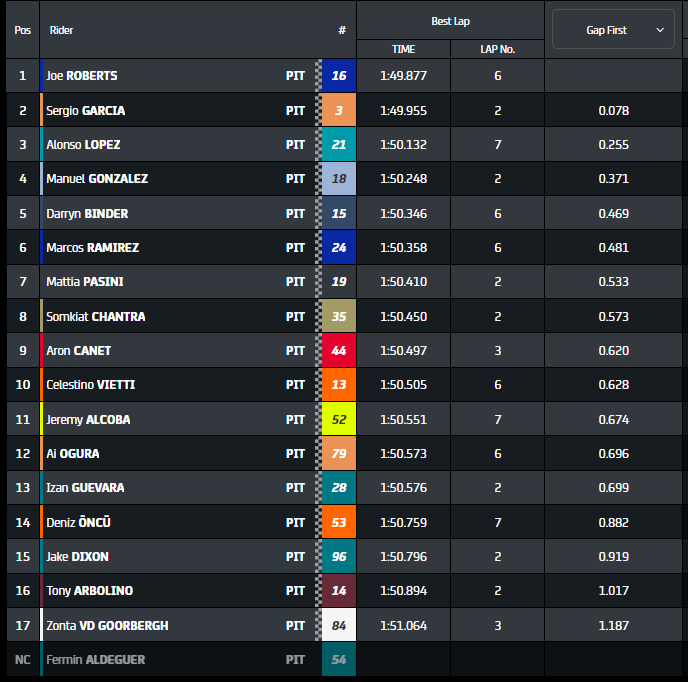 Il n’y a pas de Fermin Aldeguer, arrêté par un soudain problème de cou après l’entraînement de ce matin. Après une première visite sur le circuit, l’Espagnol se rendra à l’hôpital pour effectuer des contrôles plus approfondis et donc mieux comprendre la situation. Speed ​​​​Up espère le récupérer pour la course de demain, mais pour le moment il y a beaucoup de doutes. Pendant ce temps, ses collègues de marque commencent immédiatement à se faire remarquer, mais il y a Joe Roberts qui a l’intention de donner son mot à dire. Il y parvient, pole position avec le nouveau record absolu, juste devant deux Boscoscuros. Pas mal Mattia Pasini, 7ème et meilleur Italien des qualifications.