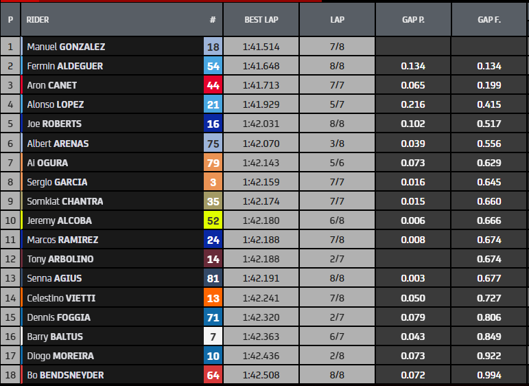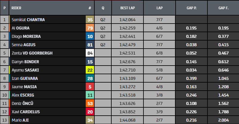 Première séance sans pilotes italiens, les trois seuls présents en Moto2 sont déjà tous passés par les Essais 2. Quatre places disponibles, mais pas facile de prédire qui pourra les remporter. De Chantra et Ogura aux débutants Sasaki, Moreira et Agius, le classement est en constante évolution. Finalement le quatuor de Boscoscuro se réunira en Q2, Ai Ogura est en effet l’un des pilotes qui avancent, aux côtés principalement de son ancien équipier Somkiat Chantra, qui réalise le meilleur temps des séances. Les deux derniers noms sont ceux des débutants Diogo Moreira (qui compose un 1-2 Italtrans, étant donné que Foggia est déjà en Q2) et Senna Agius. A la fin, on voit également Zonta van den Goorbergh assez contrarié et plaqué dans la voie des stands par un mécanicien avant qu’il n’atteigne le garage Aspar. Peu de temps auparavant, il y avait eu une évidente dispute avec Izan Guevara alors que les deux retournaient au garage.