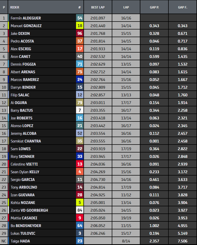 Ce matin, la nouvelle que Zonta van den Goorbergh restera chez Fieten Olie Racing GP aux côtés de Baltus (détails). Le nouveau champion Moto2 Pedro Acosta fait de son mieux, mais il n’est pas le seul : Gonzalez, Aldeguer, Canet et Lopez font bonne figure, il y a aussi Baltus qui s’intègre dans le quintette ibérique. Mais ce n’est qu’un début, d’autres noms émergent et le classement subit divers bouleversements, avec toutefois Vietti et Arbolino toujours en dehors du top 10. En effet, au fil des minutes, tous deux reculent de plus en plus… Lors des séances suivantes, ils Il faudra récupérer pour réintégrer le top 14 mené par le pilote le plus en forme du moment. Fermin Aldeguer ne se laisse pas dépasser : d’autres tentent, mais le jeune Murcien revient toujours devant, clôturant la séance avec le temps de référence.