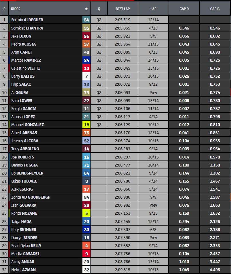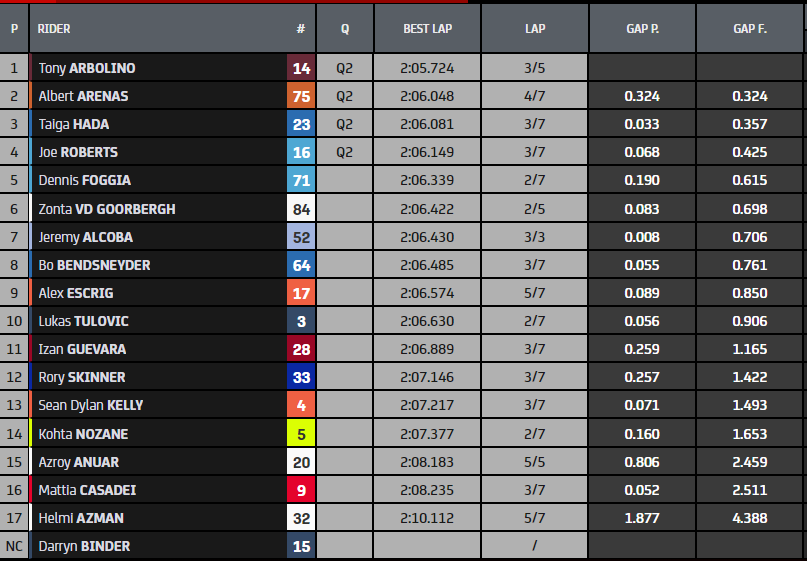Guevara n’a subi aucune blessure, mais subira de nouveaux contrôles dimanche avant la course. Binder, en revanche, est coincé dans le garage avec deux doigts disloqués et des contusions à la main droite, ainsi qu’une cheville douloureuse mais non blessée. Une année difficile pour l’ancien rookie du MotoGP et du Moto2, les blessures ne l’ont pas aidé… Les accidents de Van den Goorbergh, Alcoba et du wild card Anuar sont au rendez-vous, tandis qu’Arbolino fait également partie des protagonistes de la Q1, poursuivant un place au T2. Au final, il a réalisé le meilleur temps, dommage pour Dennis Foggia, le premier des exclus.