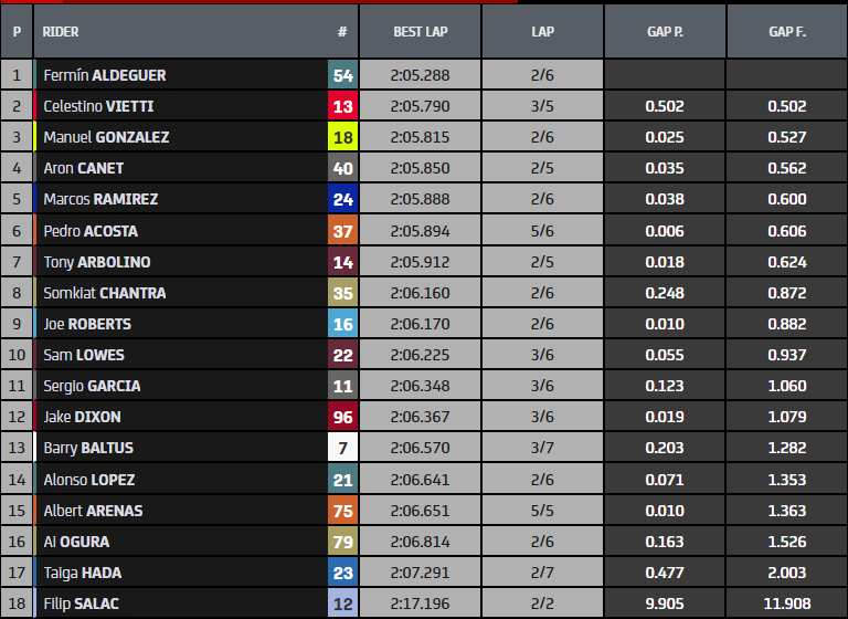 Nous connaissons désormais les noms des 18 pilotes, la lutte pour la première place sur la grille commence donc. Cependant, Filip Salac s’arrêtera prématurément après une chute au virage 7. Aldeguer prend immédiatement la tête, déterminé à continuer à confirmer l’excellente forme de la période, tandis qu’Acosta, étonnamment, n’est même pas dans le top 10… Vietti, sur Par contre, il allait très bien, il était remonté en 2ème position, mais voilà une chute au virage 4, le même point où Canet chute également en séquence. Les drapeaux jaunes suite à cet accident figent le classement : le porte-drapeau du Speed Up prend la première place sur la grille, tandis que le leader Moto2 s’élancera de la 6e place pour sa deuxième occasion de clôturer les comptes du championnat du monde.