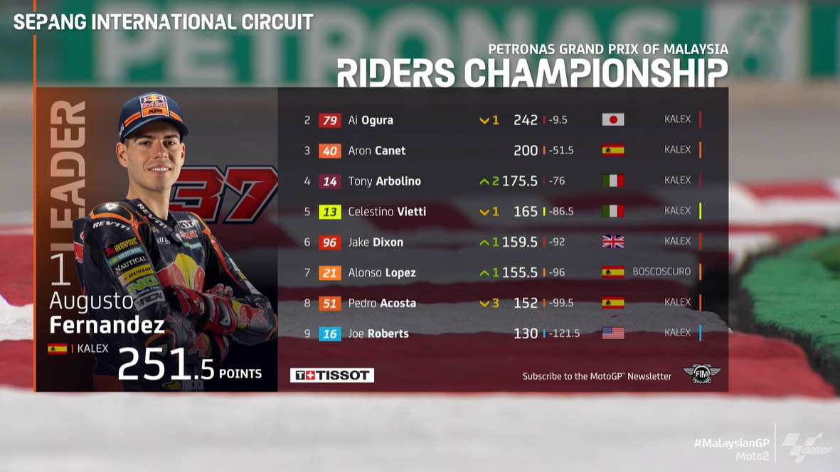Tony Arbolino, dan ada tiga! Pembalap Italia Marc VDS juga bermain liar di Sepang, kemenangan kedua dalam tiga balapan terakhir dari tur Asia / Samudra yang dialami sebagai protagonis. Pertarungan dunia, di sisi lain, tidak berakhir dengan GP kedua dari belakang tahun 2022 ini. Ai Ogura, berjuang untuk waktu yang lama dengan Arbolino, membuat kesalahan di lap terakhir dan jatuh! Dengan demikian ia kehilangan kepemimpinan Moto2 dan Augusto Fernandez kembali ke posisi 4 di depan, grand final di Valencia akan diperlukan untuk mengetahui nama juara dunia baru. Kronik GP Malaysia.