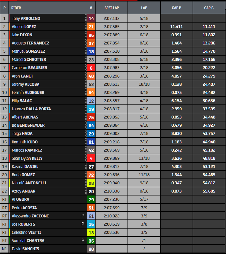 Ai Ogura di pole position, Augusto Fernandez keenam dan siap menyerang. Akhir dari perjuangan dunia atau akankah kita melanjutkan ke Valencia? Ini dimulai dengan tembakan luar biasa dari pemimpin baru Moto2, tetapi Arbolino bahkan lebih baik saat dia bergerak maju. Ada juga beberapa kekacauan di tikungan pertama, dipicu oleh sisi tinggi Chantra: pebalap Thailand itu kemudian kewalahan oleh motor Acosta (pengendara OK!), Sebuah kecelakaan yang juga menimbulkan masalah bagi Zaccone, Sanchis dan Canet. Pensiun karena masalah mekanis untuk Joe Roberts, keberangkatan awal untuk Borja Gomez, yang kemudian menerima Penalti Lap Panjang ganda. Celestino Vietti sekarang berada dalam krisis yang mendalam: dalam beberapa putaran di sini ada lagi nol, kecelakaan ke-5 dalam 7 GP terakhir …