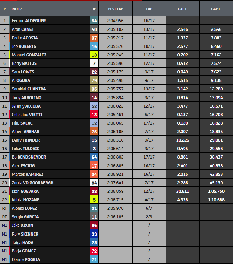 처음 몇 마디 후에 Canet이 어떻게 노력하고 있는지 분명해집니다. 그는 Acosta가 소수의 추격 자들을 이끌고있는 가운데 자신을 앞에두고 탈출을 시도합니다. 그들 중에는 잠정적으로 7위지만 다른 선수들보다 훨씬 더 고군분투하는 것 같은 Arbolino도 있습니다. 9바퀴가 남았을 때 주인공 중 한 명이 졌습니다. Lopez는 포디엄에서 견고했지만 15번째 턴에서 미끄러져 너무 일찍 레이스에서 탈락했습니다! 싸움이 벌어졌습니다. Canet은 탈출 할 수 없었고 Aldeguer와 Acosta는 다시 연결되어 승리를 위해 전투적인 트리오를 구성했습니다. 나중에 페르민 알데게르는 매우 명확한 아이디어를 가지고 그것을 구체화했습니다. 마지막으로 Aron Canet은 결승선에서 2위를 차지했고 Pedro Acosta는 가능한 한 최대한(발이 느껴졌습니다) Tony Arbolino의 리드를 2점차로 빼앗았습니다.
