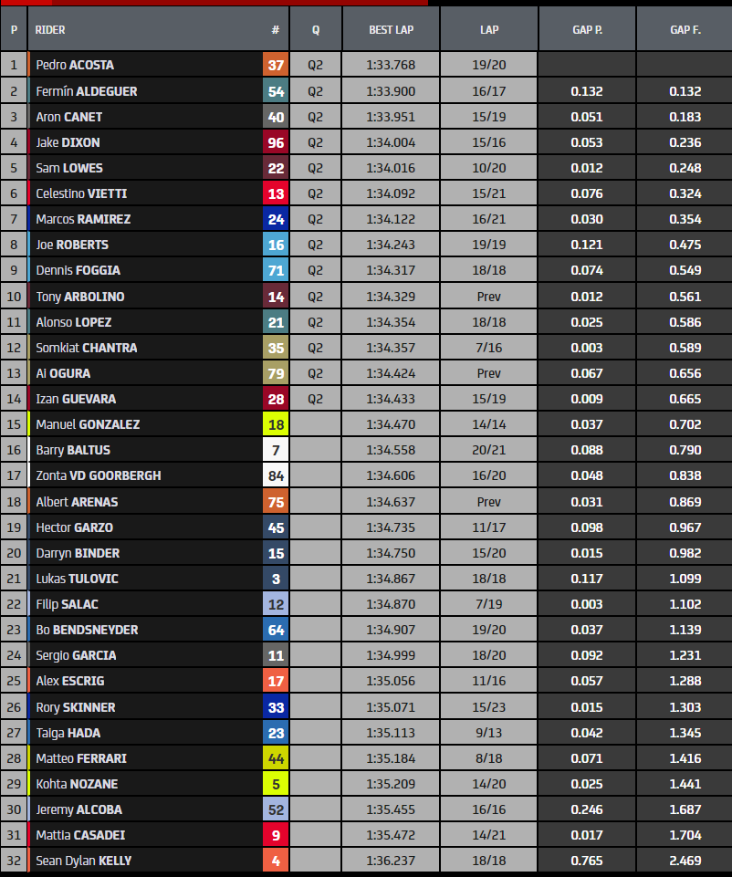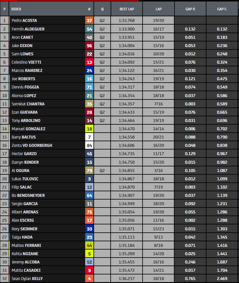 Une deuxième manche Moto2 dans laquelle on assiste à une sorte de « face-à-face » avec des contre-la-montre entre Fermin Aldeguer et Pedro Acosta. Il s’agit clairement d’un record absolu après l’avoir déjà réécrit lors de la première séance d’aujourd’hui. Au final, le nouveau champion du monde l’emporte, battant le féroce pilote Speed Up vers la fin et complétant un vendredi toujours au sommet. Top 3 100 % espagnol et complété par Aron Canet, Celestino Vietti se confirme comme le meilleur des pilotes italiens de la catégorie. C’est ainsi que s’est terminée la première journée sur le Circuit Ricardo Tormo de Valence.