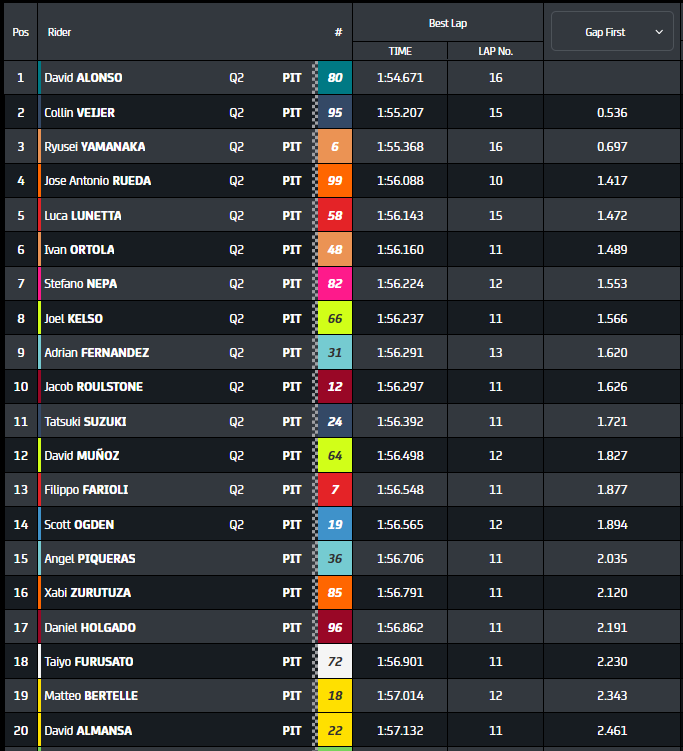 每轮比赛都改写历史记录。 这就是大卫·阿隆索所做的,他在早上的比赛中已经非常快了,但在第一场比赛中甚至更快,从排位赛的角度来看非常有用。 Moto3的领袖是一枚导弹,还有人能担心他吗? 与此同时,卢卡·卢内塔 (Luca Lunetta) 的比赛应该受到关注,他始终是主角,最后在方格旗中排名第五。 斯特凡诺·内帕 (Stefano Nepa) 和菲利波·法里奥利 (Filippo Farioli) 也暂时进入第二季度,排名将于明天早上确定,但与此同时,情况如下。