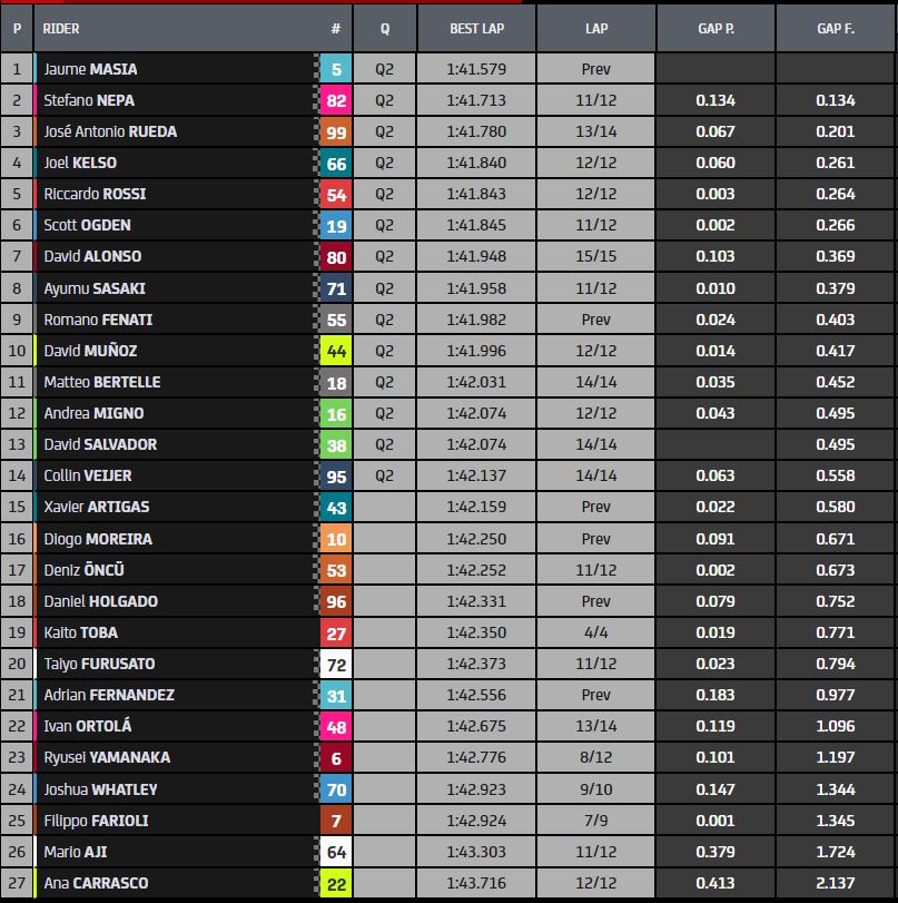 Δύο σημαντικά ατυχήματα σε αυτόν τον γύρο, καθώς και πολλές εκπλήξεις όσον αφορά την τελική κατάταξη. Ξεκινώντας από τους δύο πρώτους, πρωταγωνιστές είναι οι Kaito Toba και Filippo Farioli, στο έδαφος σε ξεχωριστά ατυχήματα μετά από επαφές με άλλους αναβάτες. Τα δύο αγόρια φάνηκαν να πονάνε, αναμένονται ενημερώσεις για δύο προκριματικούς γύρους γεμάτους εκπλήξεις. Τρεις πρωταγωνιστές συγκεκριμένα του Moto3 έμειναν εκτός των top 14 και θα πρέπει να αγωνιστούν στο Q1! Ξεκινώντας με τον παγκόσμιο ηγέτη Daniel Holgado, καθώς και τους Diogo Moreira και Deniz Oncu, που επέστρεψε από την πρώτη του παγκόσμια νίκη στο Sachsenring. Εκτός από τον άτυχο Farioli, όλοι οι Ιταλοί πήγαν κατευθείαν στο Q2. Δείτε πώς πήγε η τελευταία προπόνηση στο Άσεν.