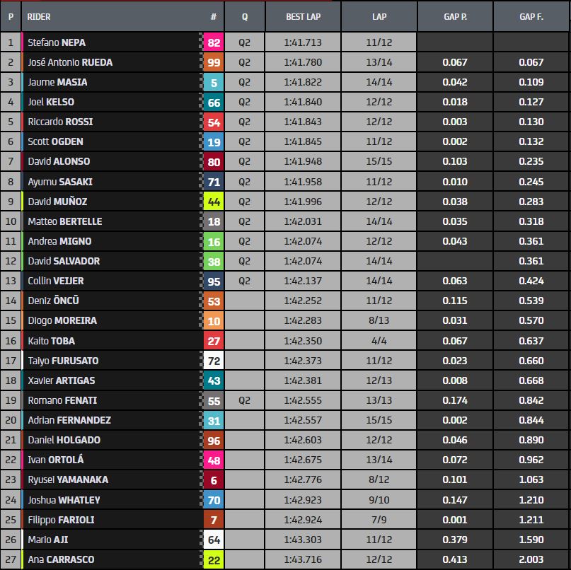 Οι Holgado, Moreira και Ortola συγκεκριμένα είναι ήδη στα δύο. Εν τω μεταξύ, η Masia έχει βάλει ένα στιγμιαίο πόδι μπροστά από τους Nepa και Fenati, ξεκινάμε ξανά από εδώ για αυτόν τον καθοριστικό γύρο όσον αφορά την πρόκριση. Καταγράφουμε επίσης μια «πολύ στενή» επαφή μεταξύ των rookies Farioli και Rueda στην είσοδο του σικάνι Geert Timmer, χωρίς συνέπειες. Αντίθετα, η πρώτη πτώση της ημέρας είναι αυτή του Toba, η δεύτερη επίσης για αυτόν, στη στεριά με μεγάλη ταχύτητα στο Meeuwenmeer. Μετά το χάος στο pit lane στην Practice 1, κάτι παρόμοιο συνέβη αυτή τη φορά, αλλά στην πίστα: Ο Toba χτύπησε το πίσω μέρος της μοτοσυκλέτας του Whatley, μετά έφυγε από τα πλάγια και κατέληξε με ένα σημαντικό καρούλι στο χαλίκι. Ο πιλότος SIC58, που διασώθηκε αμέσως από τους στρατάρχες, εμφανίζεται κάπως ζαλισμένος και μάλιστα θα μεταφερθεί στο Ιατρικό Κέντρο για ελέγχους. Στα τελευταία 5 λεπτά καταγράφουμε και τη συντριβή του Farioli μετά από μια μάλλον γαριβαλδική είσοδο του Fernandez στο Ruskenhoek. Δεν είναι καλά νέα να βλέπεις τον Ιταλό πιλότο να εκκενώνεται με φορείο…