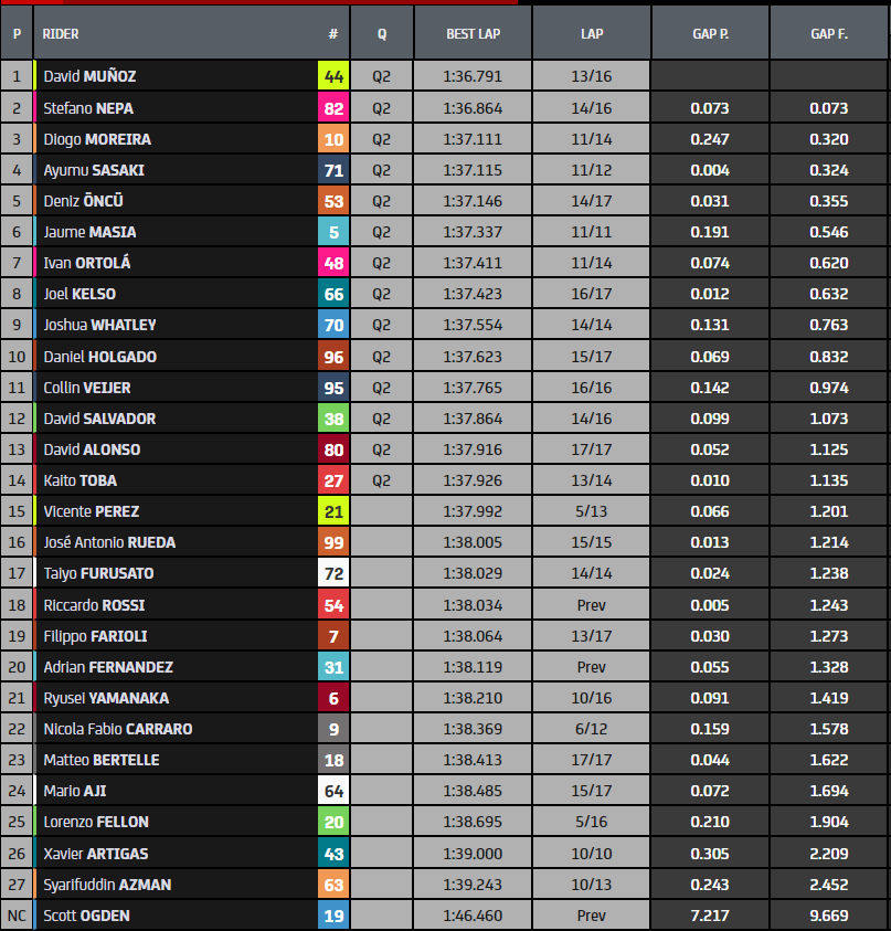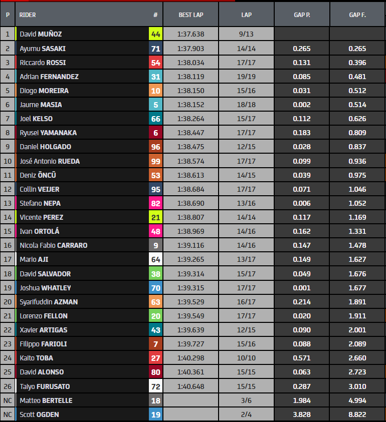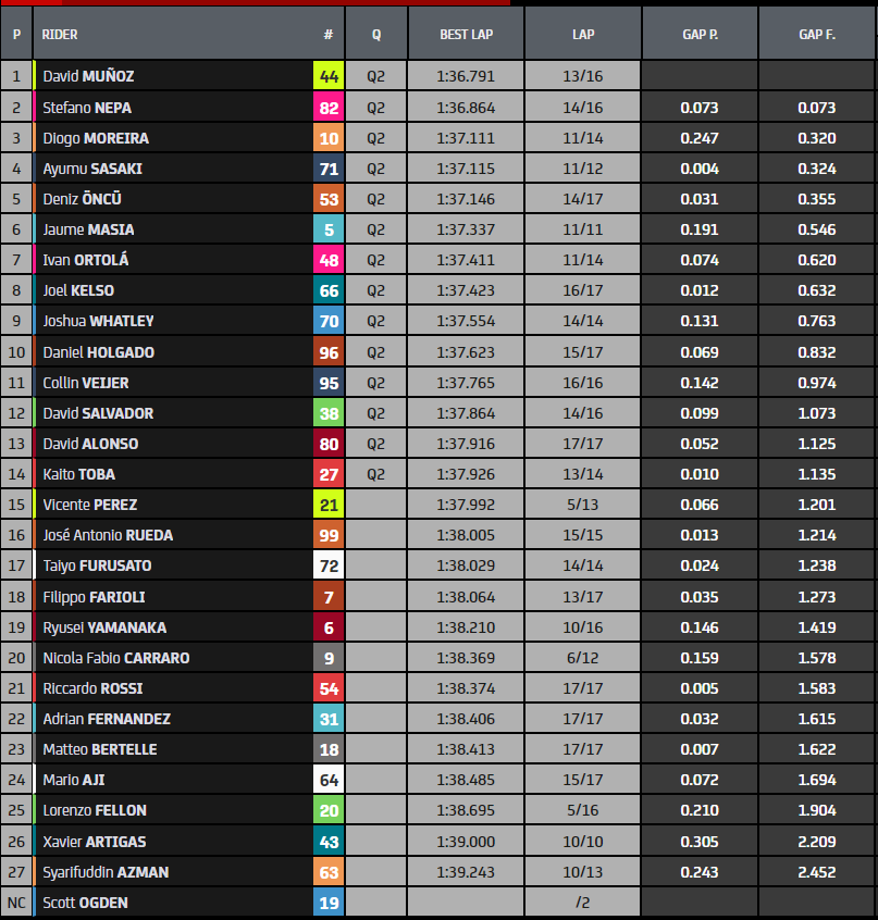 Il y a déjà une très lourde pénalité pour la course de dimanche : Xavi Artigas s’élancera du fond de grille et devra également purger deux Long Lap Penalties. Cela était dû au fait d’avoir été trop lent sur la trajectoire vers la fin des essais 1, gênant Masia qui est arrivé à la place pour son tour lancé. Les temps chutent rapidement et le classement commence immédiatement à changer, Ogden en revanche reprend le fil d’une journée noire : encore deux problèmes techniques ! Le pilote britannique est furieux, au dernier problème il laisse tomber la moto au sol et déclare clos un vendredi qui en réalité n’a jamais commencé à Phillip Island… Un petit accroc arrive aussi pour Masia, donc une autre Honda victime d’un problème technique. Un accident est signalé pour Ortola, qui a glissé au virage Miller dans la deuxième partie de la séance, mais Carraro y risque beaucoup plus. Une entrée plutôt garibaldienne de Munoz le pousse au sol, l’Italien du carambole se cogne la tête sur la Honda de l’innocent qui dépasse Aji : heureusement il n’y a pas de conséquences, mais la manœuvre de Munoz finit par faire l’objet d’une enquête.