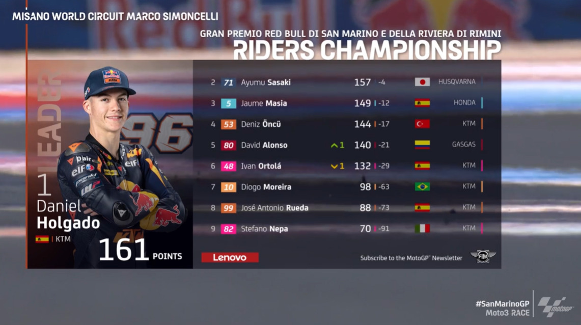 Ini merupakan kemenangan ketiga berturut-turut, yang ke-4 dalam 5 balapan terakhir, dengan satu-satunya “cacat” adalah kecelakaan di Austria saat ia masih berjuang untuk meraih kemenangan. Sebuah peta jalan yang luar biasa bagi David Alonso, pembalap pendatang baru asal Kolombia di Moto3 namun kini mampu memenangkan persaingan tanpa terlalu khawatir. Aksi overtaking ganda di lap terakhir menjadi unjuk kekuatan terakhir pebalap Aspar itu, sehingga berhasil mengalahkan Jaume Masia dan Deniz Oncu. Berlomba untuk melupakan pemimpin Moto3 Daniel Holgado yang kehilangan poin, dengan pembalap tuan rumah tertinggal. Kabar balapan di Sirkuit Dunia Misano.