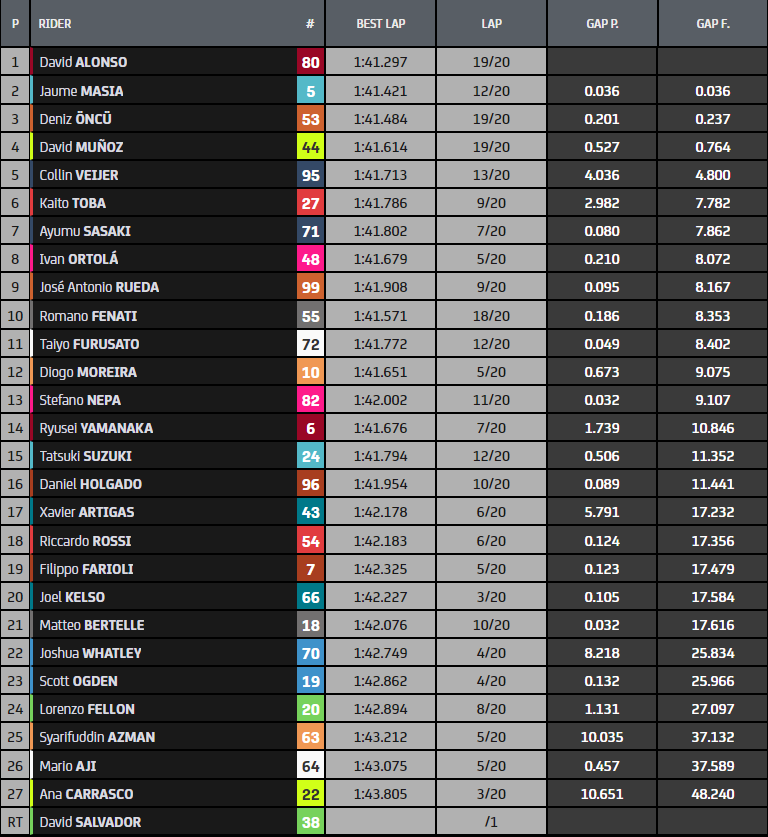 Tembakan super dari Sasaki, tetapi Masia segera merespons dan setelah beberapa tikungan dia unggul. Ortola, di sisi lain, berada dalam masalah, membuat kesalahan dan berakhir sangat melebar dari Carro, sehingga peringkatnya turun. Dia tidak menggores pemimpin Moto3 Holgado di luar 10 besar, Salvador segera jatuh, sementara pembalap Spanyol dari Leopard tidak membuang banyak waktu dan segera mencoba melarikan diri. Untuk sementara dia berhasil, tapi tidak lama: Oncu dan Moreira khususnya pertama-tama turun kembali, kemudian dibentuk kelompok agresif yang terdiri dari sembilan pilot, hingga berkurang lagi, kali ini menjadi empat pilot, lalu menjadi tiga. Penalti Long Lap diberikan kepada Farioli karena batasan lintasan, sementara pertarungan memanas di lap terakhir. Khususnya di akhir, dengan Alonso liar yang melakukan double overtaking terhadap Masia dan Oncu, meraih kemenangan besar dunia lainnya! 10 comeback teratas untuk Romano Fenati, Stefano Nepa di urutan ke-13, pemimpin Daniel Holgado finis di urutan ke-16. Lawan kembali ke bawah…