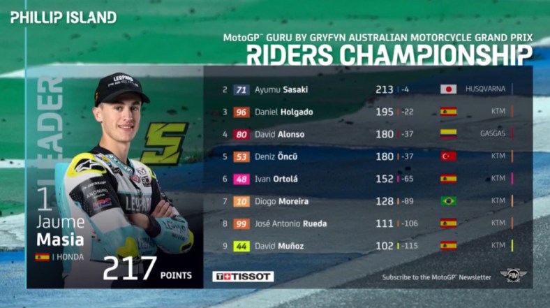 Fernandez avait tenté une mini-évasion, mais quatre d’entre eux l’avaient rattrapé. Cependant, Oncu a d’abord dû serrer un peu les gaz après trois gros risques, Fernandez en a plutôt profité pour tenter de s’échapper à nouveau, mais le rêve s’est terminé par une chute au virage 11 ! Sasaki passe devant, qui a la belle opportunité de prendre également le leadership mondial, mais il y a un Deniz Oncu qui n’est pas particulièrement d’accord et se met derrière le pilote Intact GP. Il l’étudie longuement, fait quelques petites tentatives, et trouve enfin le moment gagnant dans les derniers virages du dernier tour ! Deniz Oncu triomphe dans ce fou GP d’Australie, Ayumu Sasaki est encore battu dans les derniers instants d’une course… se réjouit Joel Kelso, australien sur le podium pour la première fois en Moto3 et à domicile !