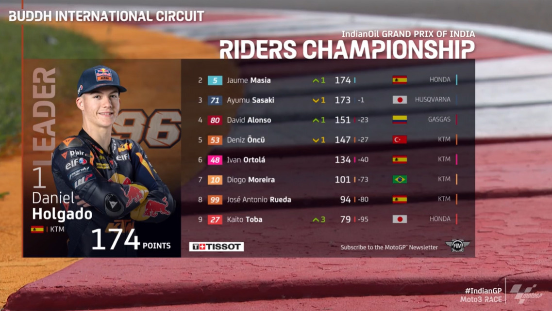 Tidak ada seorang pun yang mampu menghentikan Jaume Masia. Ayumu Sasaki mencoba, namun pilot Leopard tidak dapat dihentikan dan akhirnya berhasil melarikan diri, meraih kemenangan solo yang besar. Dan secara pasti mencapai pemimpin Daniel Holgado di peringkat teratas Moto3! Kedua adalah pembalap Jepang dari Intact GP, kecewa dengan kontak terakhir yang menjatuhkan rekan setimnya Collin Veijer (Sasaki berada di depan) dan sekarang -1 di belakang duo terdepan. SIC58 Squadra Corse, satu-satunya pemenang GP Italia yang tajam, kembali ke podium: pembalapnya Kaito Toba berhasil mengaum dan mengambil langkah terakhir di Sirkuit Internasional Buddh, di akhir balapan yang sangat sulit bagi semua orang. Kronik Grand Prix India.