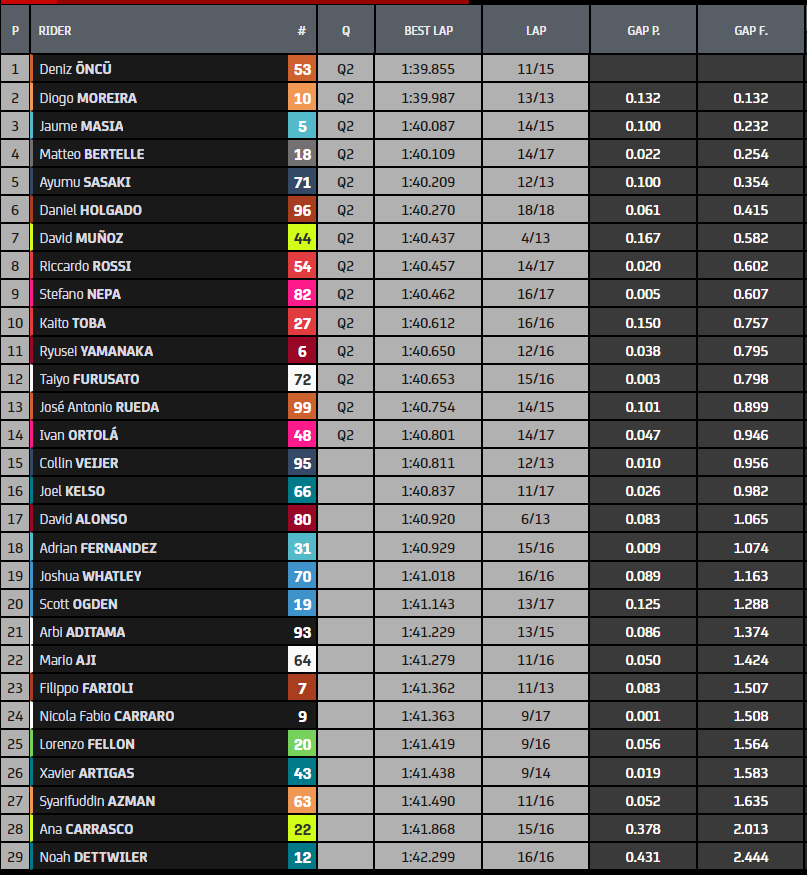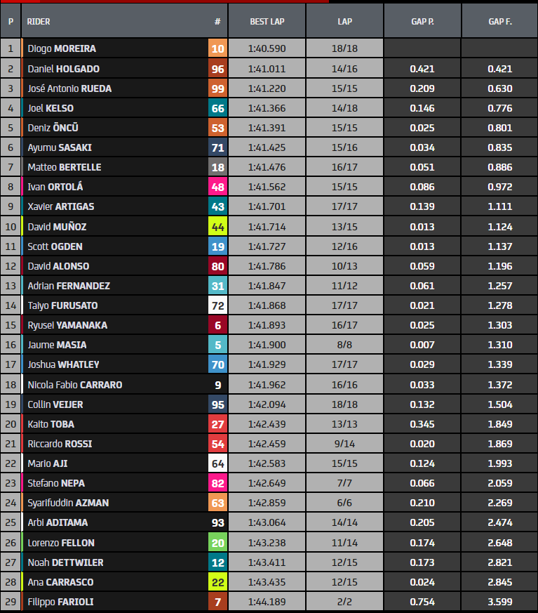 La piste est très sale et en témoignent les nombreux accidents peu après le début de la séance, à commencer par un highside de Jaume Masia, lors de son premier GP en tant que leader du championnat du monde Moto3. Cela a été suivi par les chutes de Syarifuddin Azman, Filippo Farioli, Stefano Nepa, Adrian Fernandez, Kaito Toba (évitant de peu Furusato qui le précédait). En effet, un deuxième accident viendra également pour Masia, cette fois une glissade dans les 10 dernières minutes de la manche. Le dernier sur la liste des victimes d’accidents est David Alonso, tandis qu’en tête de liste se trouve Diogo Moreira devant Daniel Holgado et José Antonio Rueda.